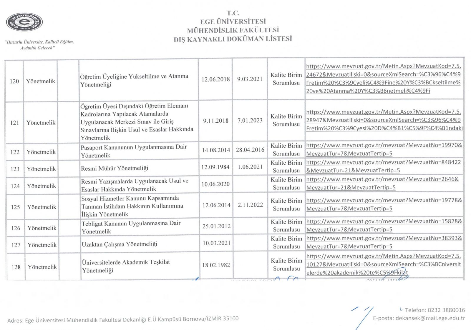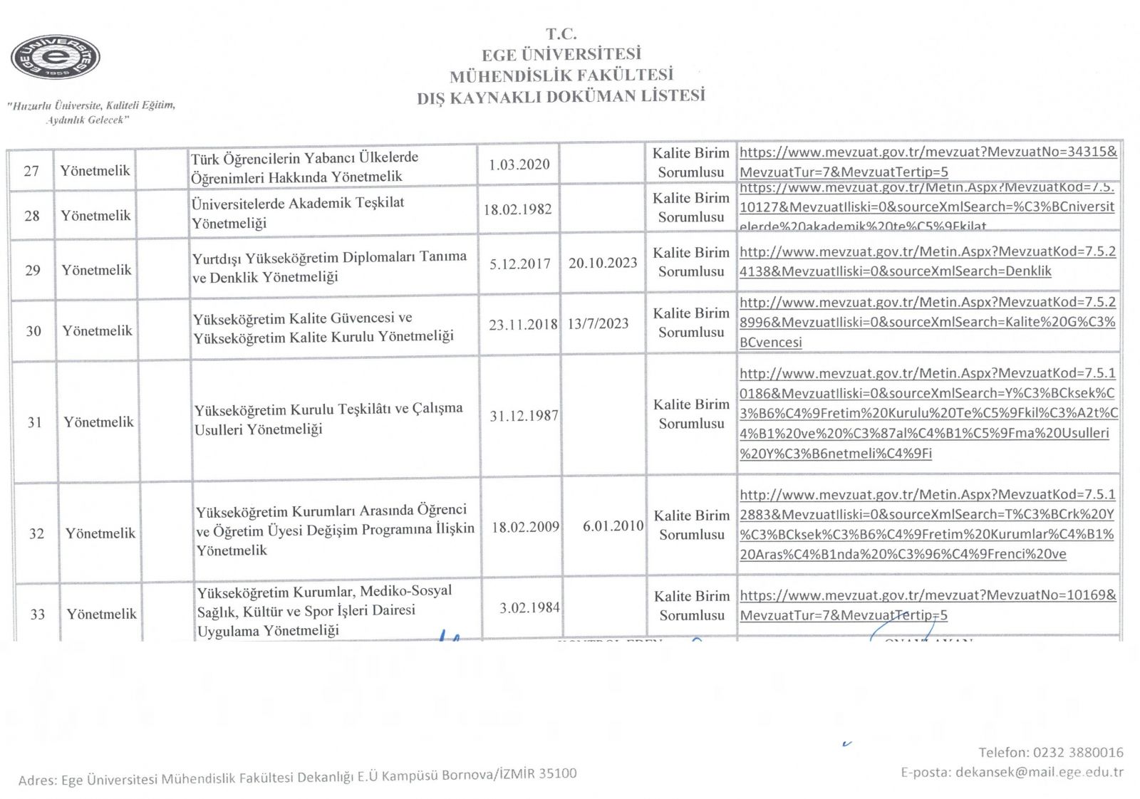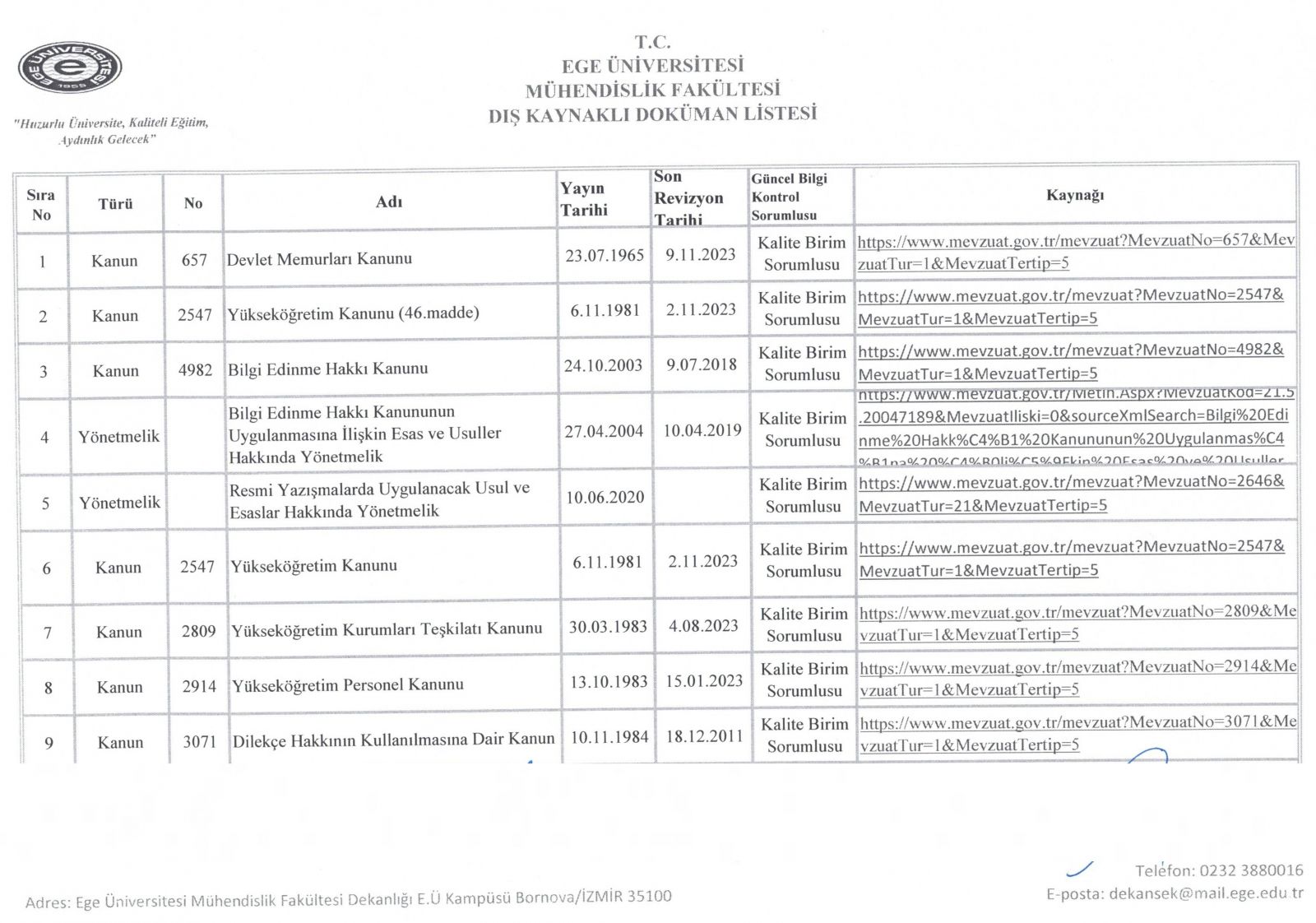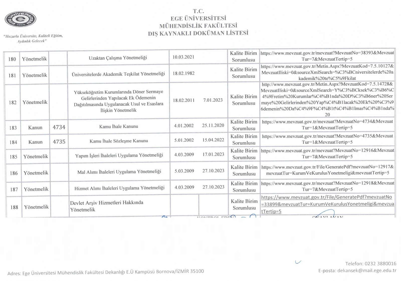 Dış Kaynaklı Doküman Listesi
