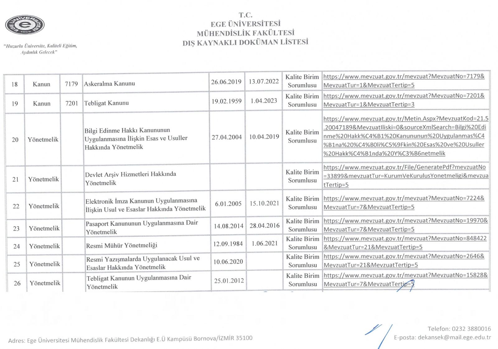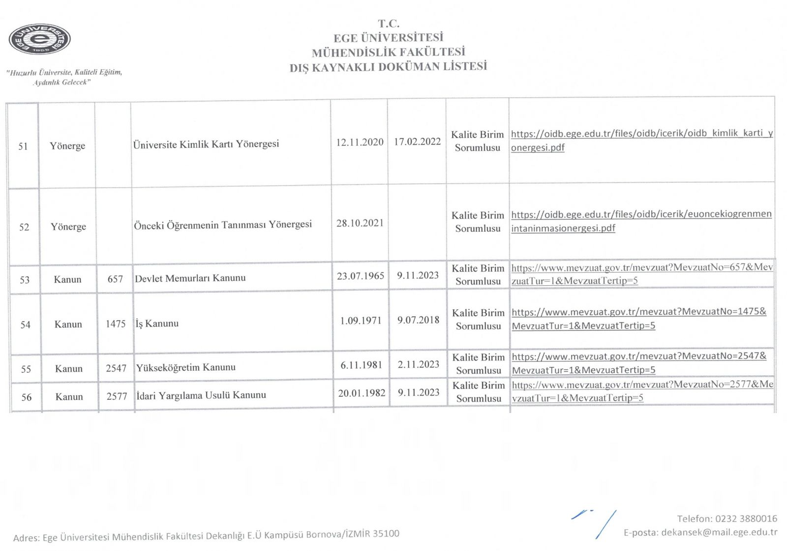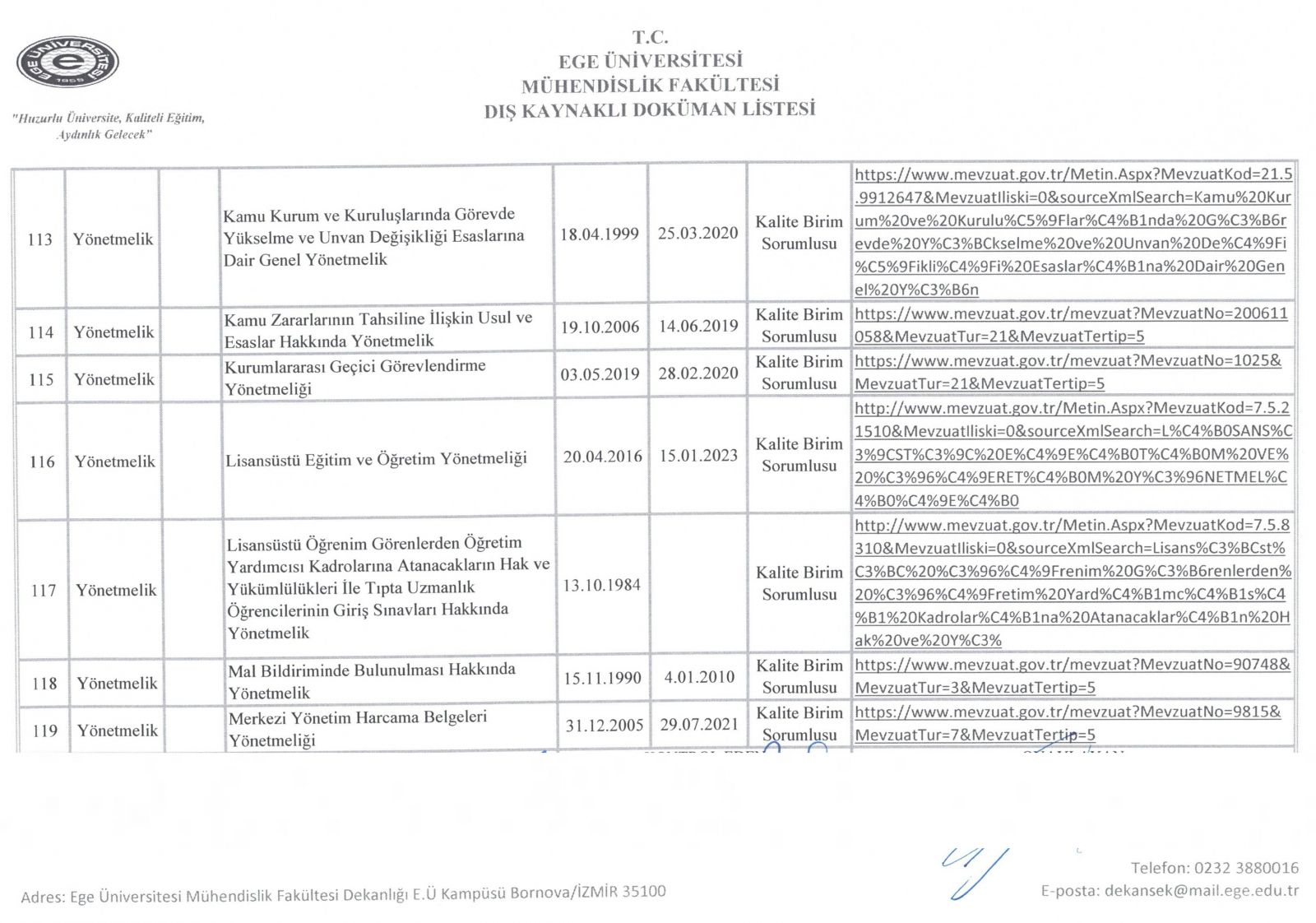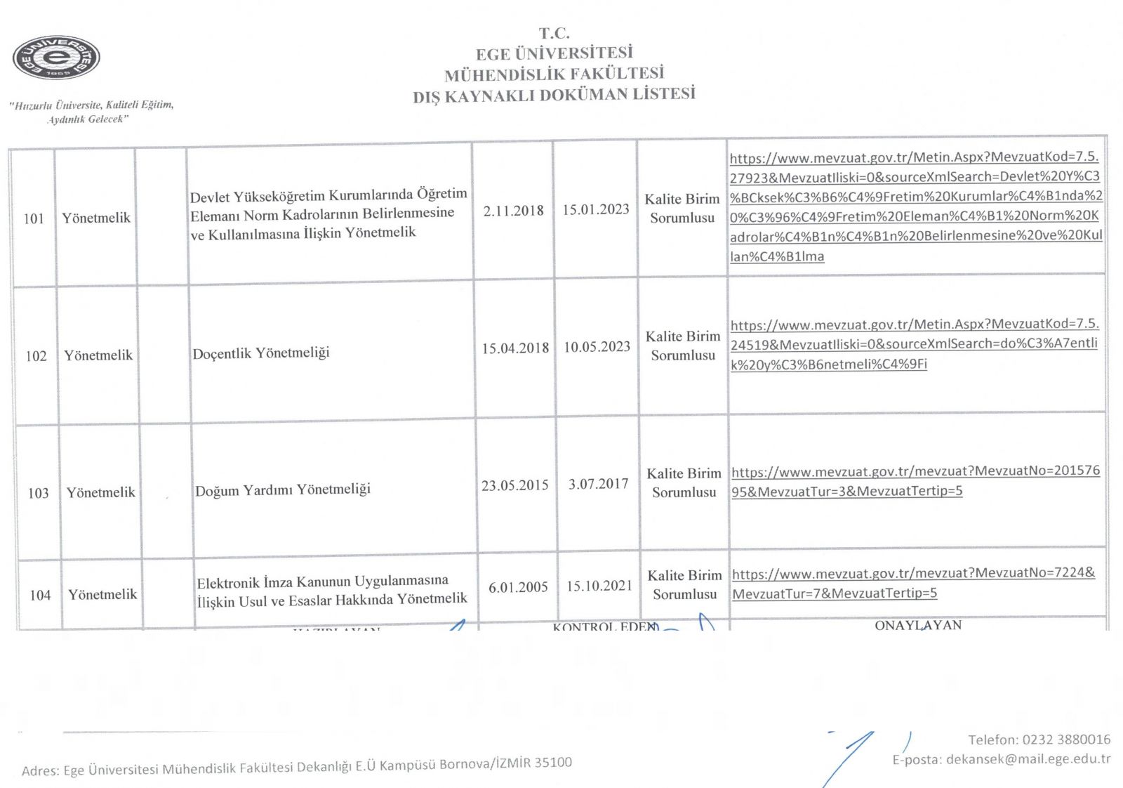 Dış Kaynaklı Doküman Listesi