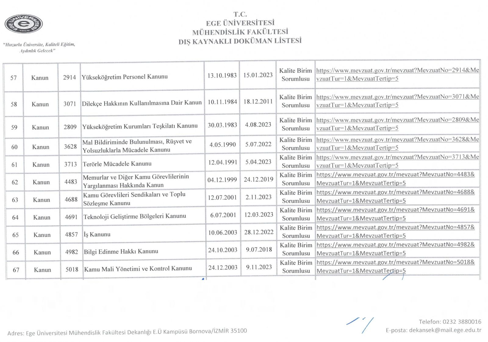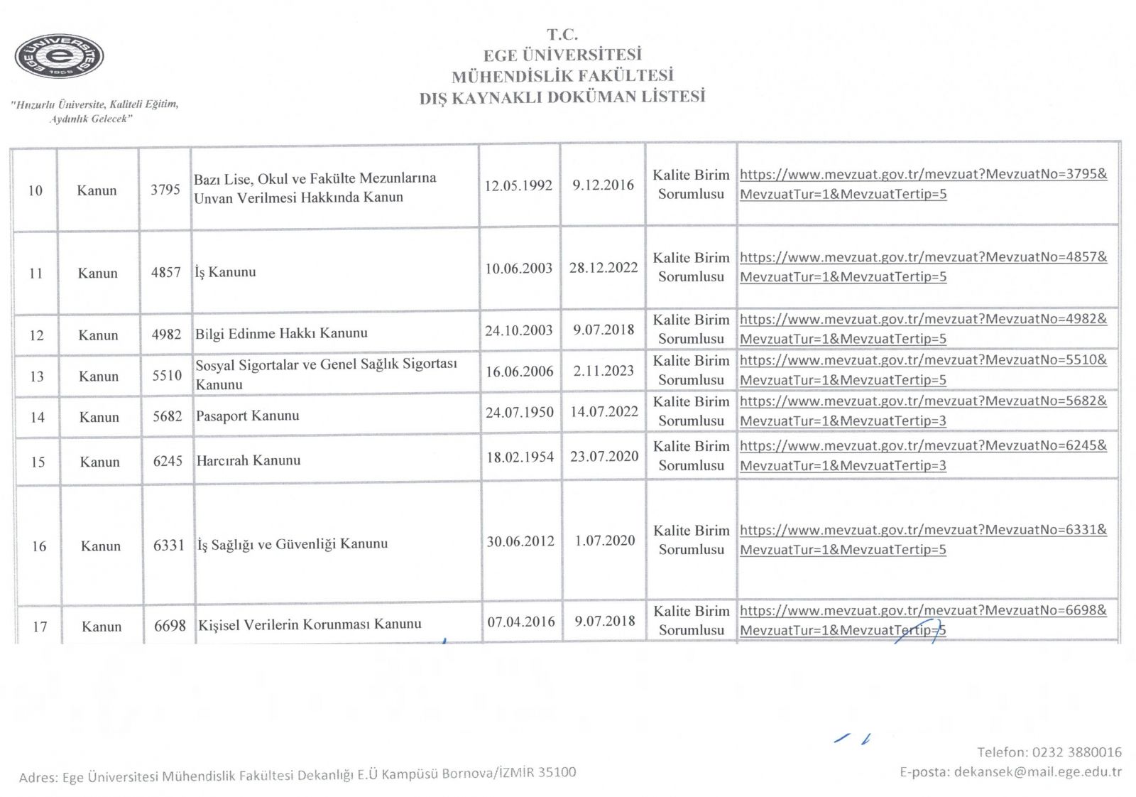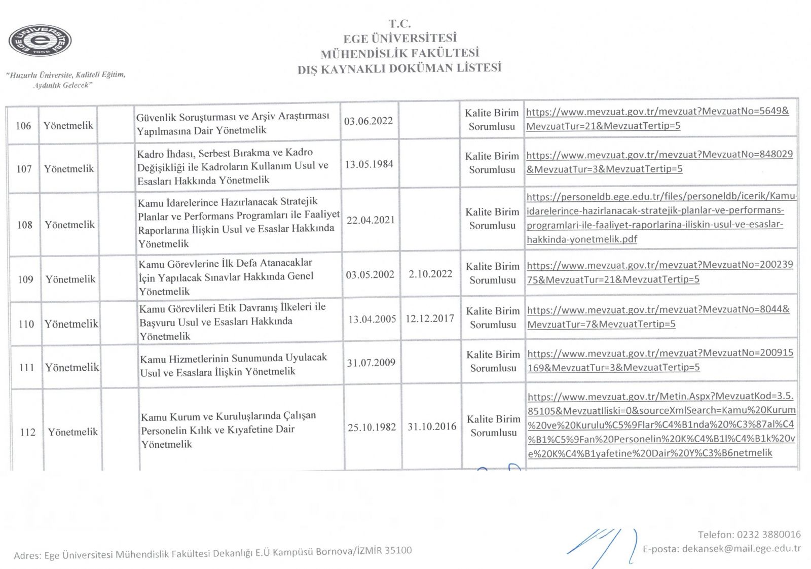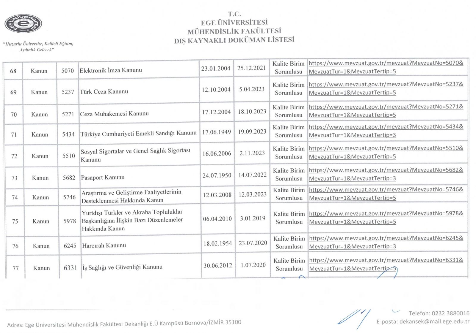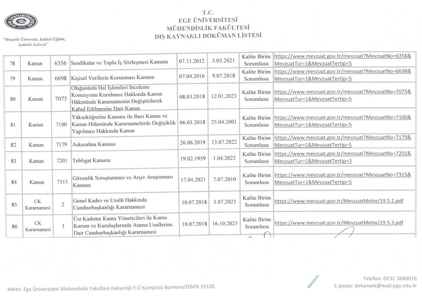 Dış Kaynaklı Doküman Listesi