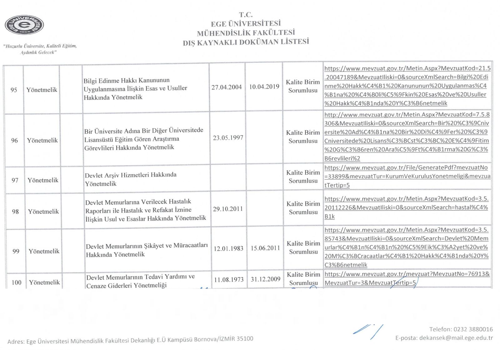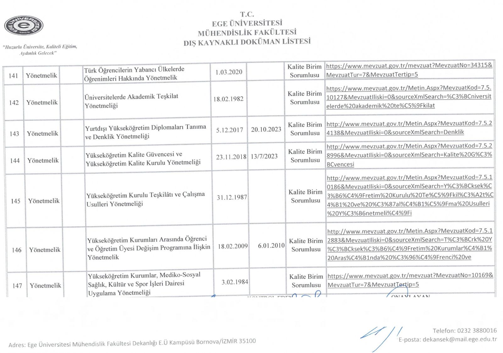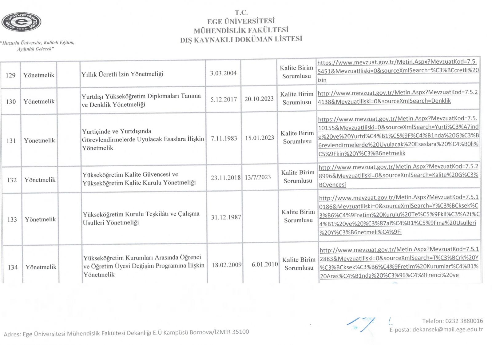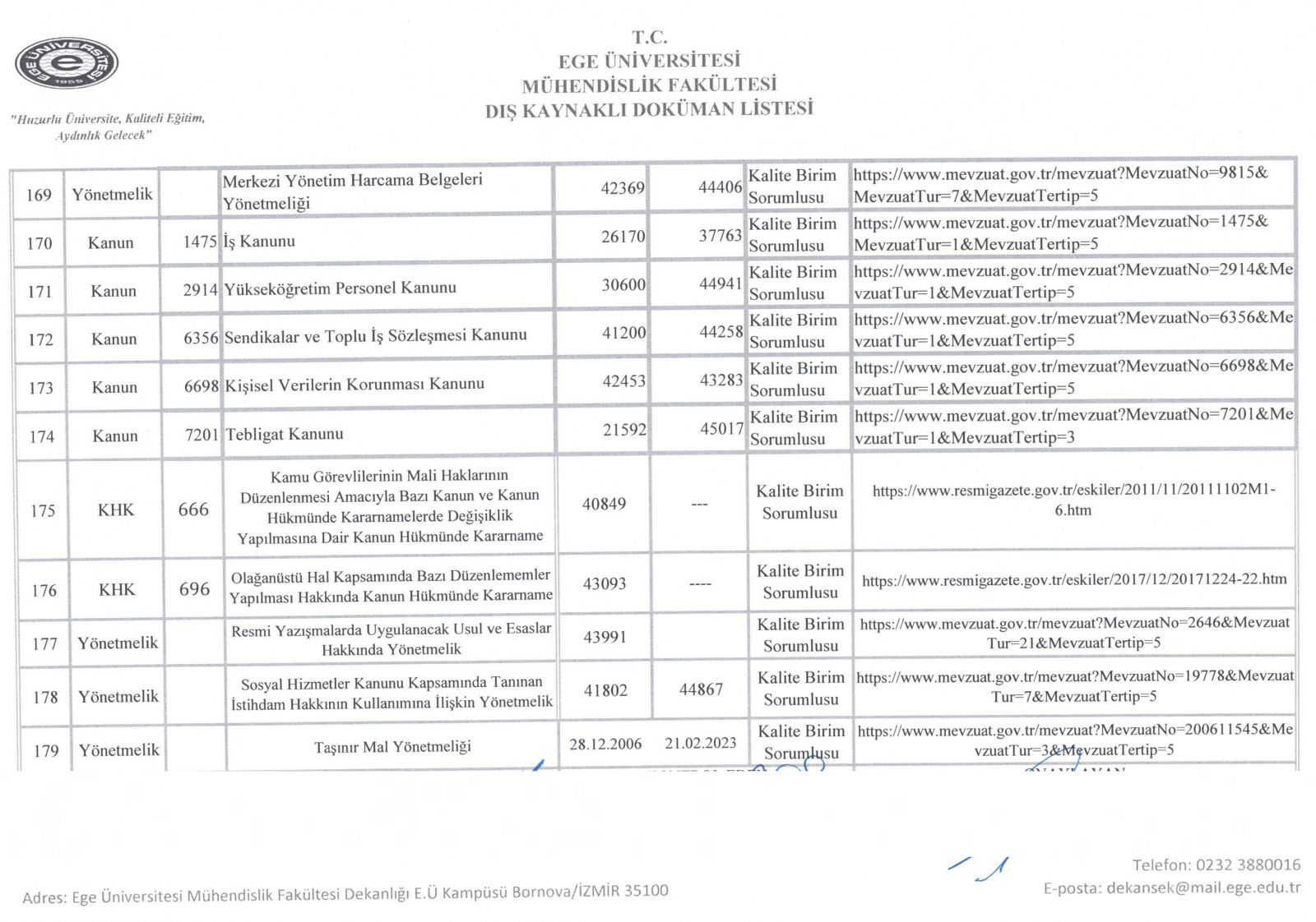 Dış Kaynaklı Doküman Listesi