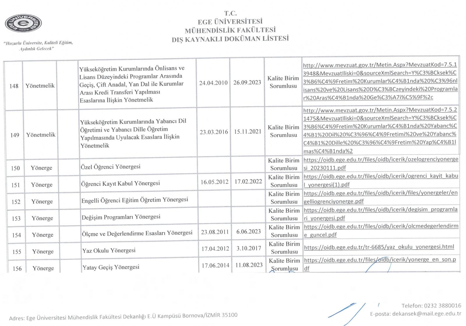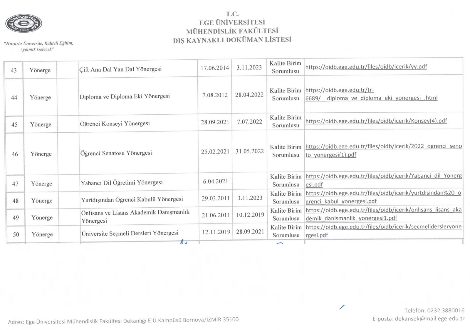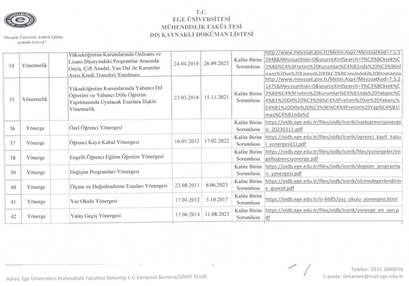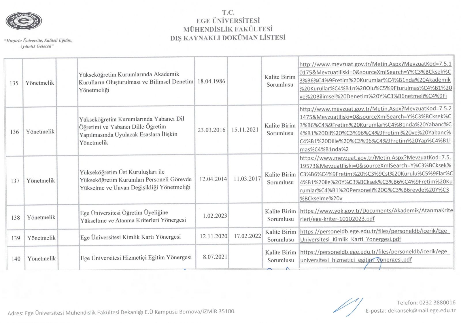 Dış Kaynaklı Doküman Listesi
